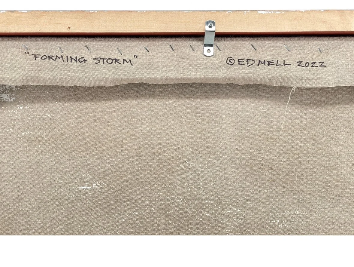 In 2025, at a Scottsdale Artists’ School studio sale, I came across some of Ed Mell’s unused stretched linen panels. At first I questioned if these were his, but after buying two and taking them home I noticed some hand writing along the side of one that clearly matched Ed Mell’s sharp angular hand writing style.